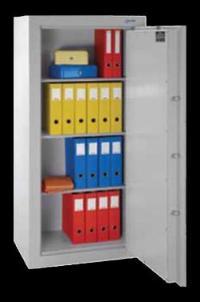 - Feuerschutz: Feuerschutz nach DIN 4102 - Versicherbare Bargeldsumme Fr. 50`000.- - Gehäuse und Türe doppelwandig - Türstärke 92 mm - 3-seitieg Verriegelung mit 25 mm Rundbolzen - Starre Verschlussbolzen auf der Bandseite - Türgriff 65 mm vorstehend - Tablare verstellbar - Je 2 Verankerungslöcher in Rückwand und Boden - Verschluss: Doppelbartschloss mit 2 Schlüssel