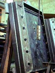 In dieser Aufnahme steht die Panzertür auf dem Kopf und wird von oben mit Spezialbeton befüllt. Die Stärke des Türblattes ist 450 mm. Schwerste und massivste Panzer-Armierungen wurden mit geheimen Spezial-Armierungsmaterialien eingebaut.
